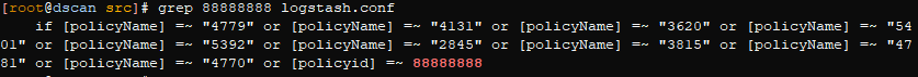 + sed -i 's/\[policyName] =~ "4770"/\[policyName] =~ "4770" or [policyid] =~ 88888888/g' /usr/local/src/logstash.conf