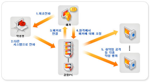 1) 악성봇은 해커에 의해 제작되어 최초로 전파됩니다.