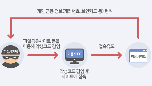 휴대폰을 이용하는 스미싱이나 보이스피싱과는 달리 컴퓨터를 이용한 범죄랍니다. 사용자의 PC에 바이러스나 악성코드를 몰래 감염시켜 이용자가 포털 검색이나 즐겨찾기를 통하여 금융 사이트나 정상적인 홈페이지를 방문하였을 때, 가짜 피싱 사이트로 유도되고, 금융 정보를 요구하여 금융 거래 정보 등을 몰래 빼가는 수법인 신종 금융 사기의 주요 범행 수단.