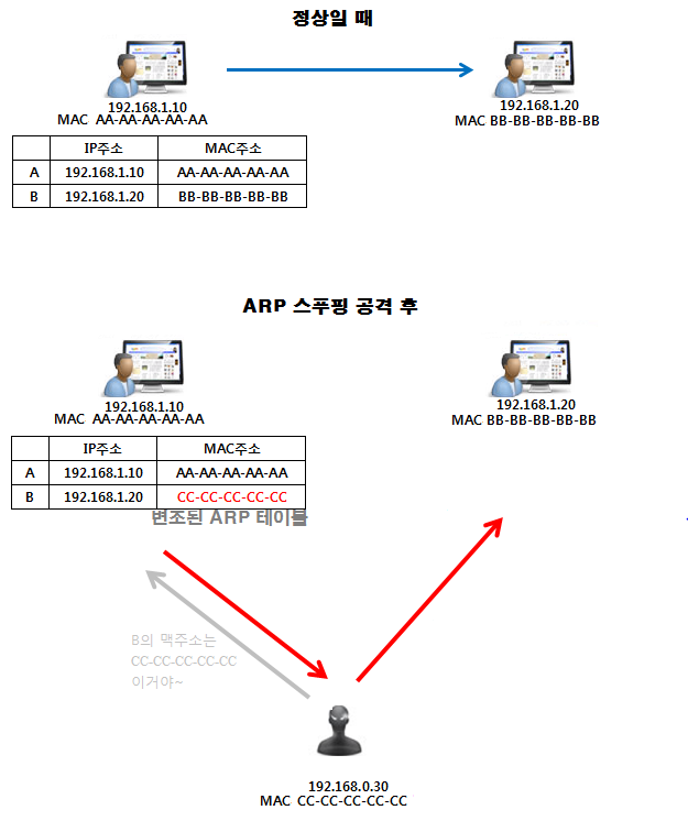 MAC주소를 IP로 변환하는 프로토콜로서 ARP스푸핑 공격은 통신하는 두 대상의 MAC주소를 공격자 자신의 MAC주소로 바뀌어 중간에서 패킷을 가로채는 공격입니다.