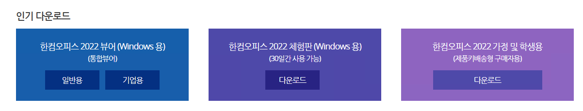 다운로드에 보시면 아래와 같이 한컴오피스 뷰어 2022 통합 뷰어가 있고 체험판으로 30일 사용 가능한 것이 있으며