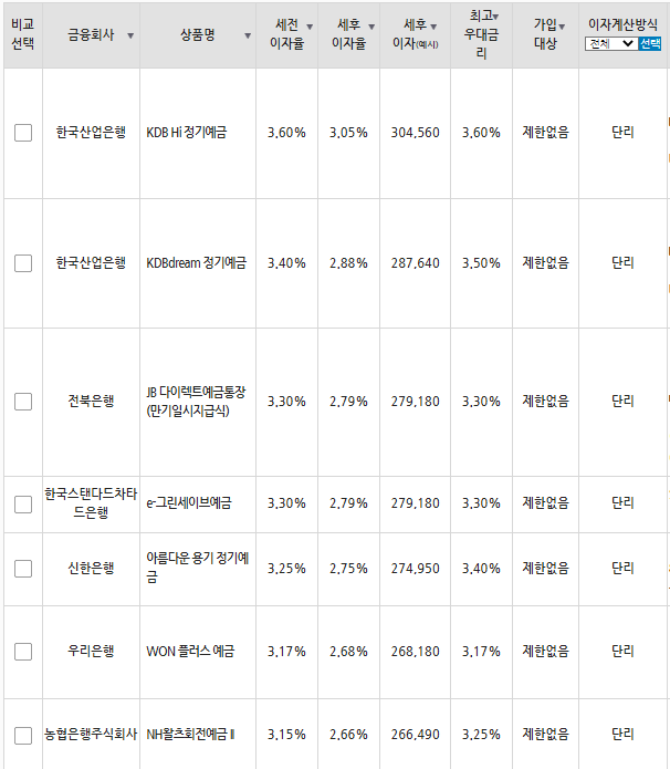세전 세후 이자율및 최고우대금리 기준으로 볼수 있는 장점이 있습니다. 두번째 금융감독원을 이용한 방법도 비슷한 결과가 나타납니다. 참고할 사항은 금감원에서는 금융회사의 상품별 이자율이나 거래조건이 수시로 바뀌는 이유로 지연되서 공시될 수도 있어 실제 거래 전에는 반드시 해당 은행(금융회사)에 문의하는게 바람직합니다.