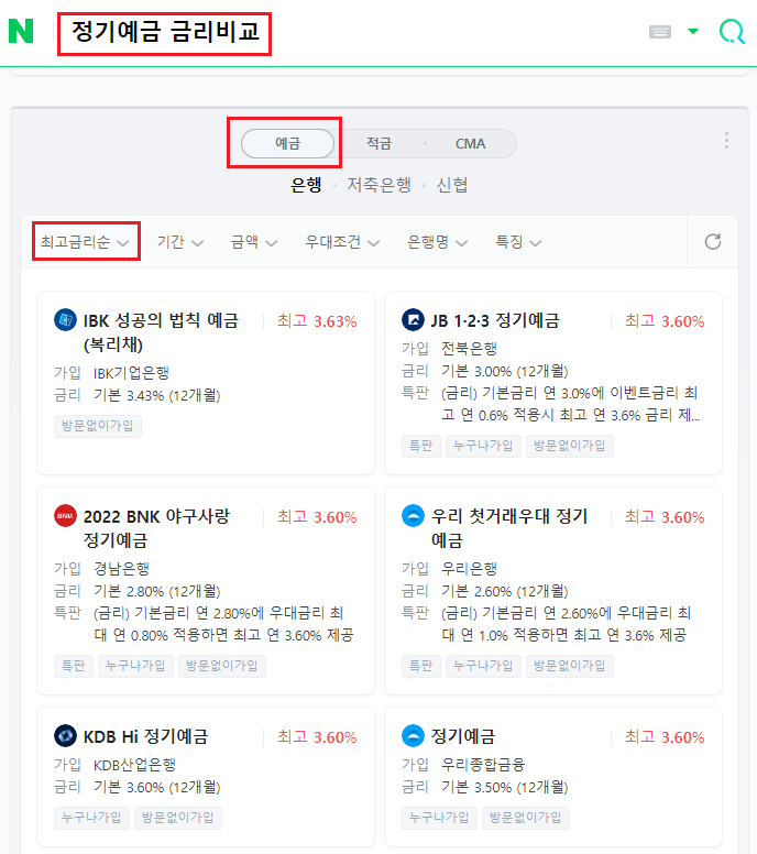 N사에서 제공하는 정기예금.적금 금리에 대한 정보는 각 금융회사의 웹페이지의 공개된 자료를 토대로 제공되는 데이터입니다. 가장 확실한 방법은 첫 번째 방법을 이용하는것을 추천 합니다.