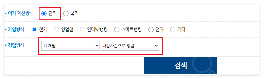 이자계산 방식은 "단리"로 선택하고 가입방식은 "전체" 출력 결과 정렬방식은 12개월 기준 내림차순으로 정렬하여보시면 한눈에 보기 쉽습니다.