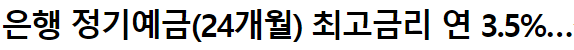 국내 시중은행의 정기예금 상품중 최고금리는 연 3.5%인 것으로 확인되었습니다. 이정도로 높은 이율이라면 보유 자산 금액이 클시 예금으로 거치한다면 굉장한 메리트가 있게되는 것입니다.