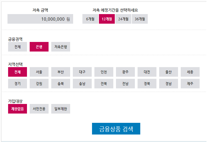예치금액 실제 저축금액을 가상으로 입력후 저축 예정기간은 12개월로 은행권 혹은 저축은행권을 구분하여 검색결과를 한눈에 보기 쉽게 정렬하여 확인 가능합니다.