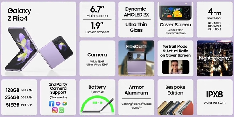 갤럭시 z 플립4 달라진점을 요약하자면, 카메라 성능이 개선되었으며 배터리용량은 늘어났습니다. 그리고 CPU등 칩셋 성능이 더 좋아졌으며, 모양새는 내구성은 강해지고 힌지는 슬림해졌습니다. 그리고 커버 스크린 기능이 더욱 다양해졌습니다.