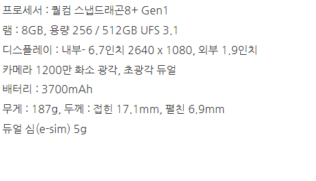 | 디스플레이 | 6.7인치 다이나믹 아몰레드 2 (2640*1080) 커버 1.9인치 (슈퍼아몰레드 260*512) |