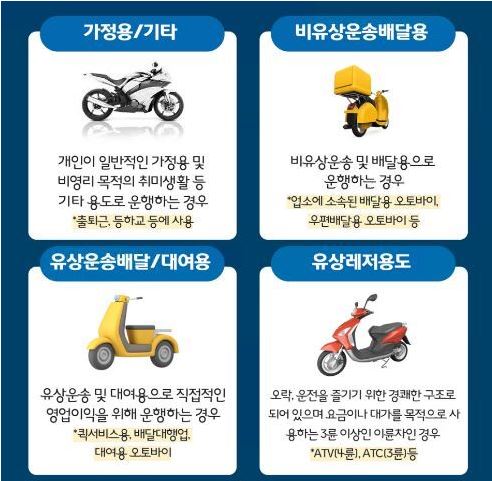 - 정확한 이륜차 사용용도를 확인하지 않았을 때, 향후 사로시 보상처리가 되지 않을 수 있다는 점을 알아야 합니다.