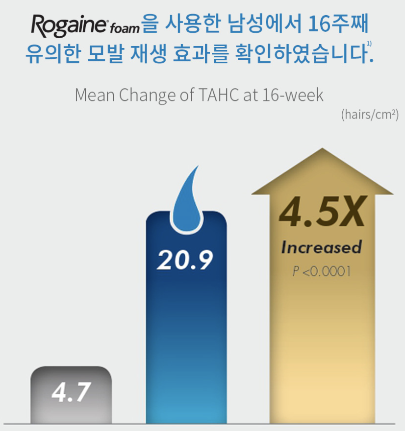 다양한 임상실험을 통해 효능과 효과가 입증되었는데요. 임상 실험 결과 남성 10명 중 9명은 4개월 동안 하루 두 번 사용으로 모발을 유지하거나 재성장 시킨 것으로 확인되었으며, 여성의 경우 약 6개월의 사용에서 위약군 대비 모발 수가 3배가량 증가한 것이 실험으로 확인되었습니다. 그리고 "폼"이라는 제형 특성상 액상형과 비교해 모낭 및 두피 흡수율이 5배가량 높고, 전신 흡수율은 절반으로 낮춰 따갑거나 가려움 등의 증상을 없앤 것이 특징입니다.