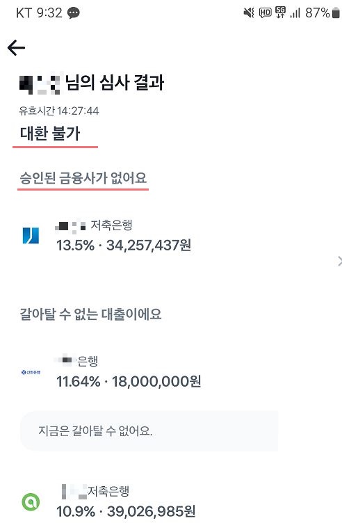 실제 대환대출 플랫폼 인프라 이용 후기를 추가합니다. 결론은 제 입장에서는 대 실망입니다. 이유는 실제 진행해본 결과 저의 경우 갈아탈 수 없다는 것이 결론입니다. 즉 대환대출이 힘들다는 것인데요 저의 경우 신용점수는 630이고 기 대출금액은 11.6% 저축은행대출 3900만 원, 13.5% 금리로 또 다른 저축은행 3400만 원이 있는데요 두 가지다 갈아타기가 조건에 부합되지 않아 안되는 것으로 나옵니다. 카카오페이, 토스, 핀다, 뱅크샐러드 모두 환승 불가 판정 입니다.