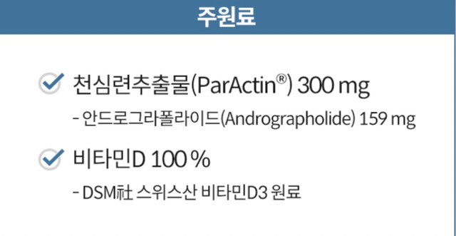 주요 핵심 원료 성분 천심련 추출물은 100% 식물 유래 성분으로 관절 건강에 도움이 되는 핵심 성분 안드로그라폴라이드를 풍부하게 함유하고 있는 것이 특징입니다.