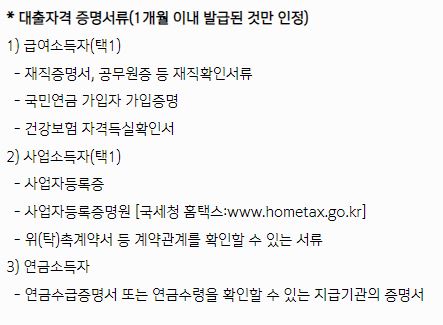 - 대출 자격 : 급여소득자일 경우 연소득이 1200만원 이상 현재 직장에 재직기간이 5개월 이상 되었으면 신청 가능, 사업소득자의 경우 연소득이 6백만 원 이상 사업자등록증 개업일 기준으로 4개월 이상 사업을 지속했다는 증빙이 가능하면 됩니다. 연금소득자의 경우는 연소득이 6백만 원 이상이고, 1개월 이상 연금 수령 증빙이 가능하면 됩니다.