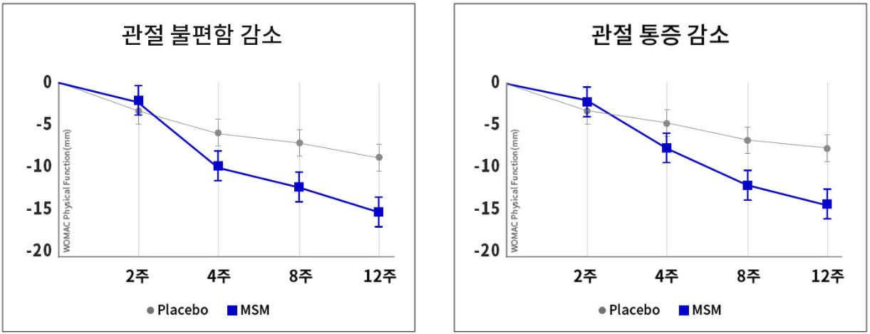 실제 특정 나이대를 대상으로 무릎 관절이 불편한 성인 60명에게 12주간 MSM에 대한 인체적용시험 진행 결과 관절 통증 감소 및 관절 붓기와 뻐근함 등 불편했던 부위가 유의적으로 개선됨이 다양한 실험을 통해 입증되었습니다.