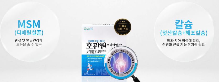 동진제약에서 개발한 관절 연골 건강에 도움을 줄 수 있는 대한민국 식약처로부터 기능성을 인증받은 핵심 원료 MSM을 주요 핵심 성분으로 개발된 건강 기능 식품입니다. 관련 분야에서 매년 다양한 수상을 차지하는 등 판매량이나 대중들에게 매우 인지도가 높은 브랜드입니다.