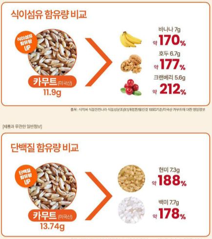 그냥 겉으로 보기에는 일반 현미와 비슷합니다. 쫀득하고 부드러운 식감을 가지고 있으며, 씹을수록 고소한 맛이 납니다. 그리고 카무트는 일반 밀에 비해 필수 아미노산, 비타민 및 무기질이 풍부하고 식이섬유 함량이 매우 높은 특징을 가지고 있습니다.