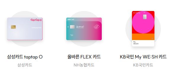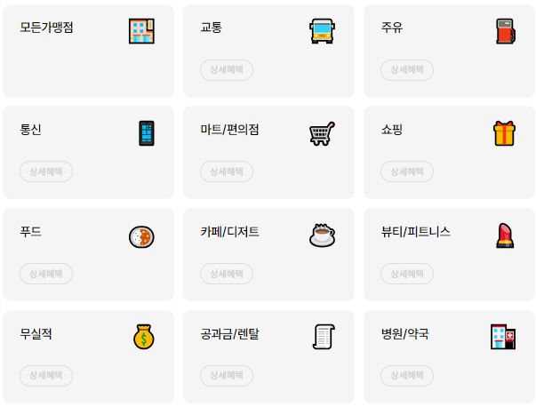 - 혜택별 인기차트 : 통신비, 공과금, 주유, 차량정비, 쇼핑, 항공마일리지, 점심+교통, 무실적+모든 가맹점, 구독/스트리밍, 해외직구, 배달앱+간편 결제, 편의점+카페, 마트+교육비, 여행+바우처, 제휴/PLCC, 증권사 CMA 등.