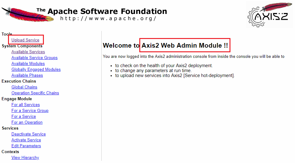 관리자 페이지 (http://x.x.x.x:0000/xxxx/axis2-admin/)