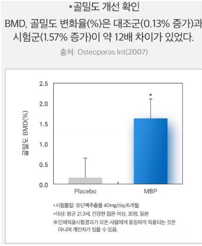 MBP 효능을 살펴보자면, 인체적용 시험 결과 다양한 기능성 원료 중 하나인 MBP의 효능은 다음과 같이 확인되었습니다. 6개월간 유단백질 추출물을 일일 권장 섭취량에 맞춰 섭취하도록 한 후 다양한 실험을 실시하였으며, 이를 통해 골밀도 및 골강도 증가, 뼈 형성 지표 상승, 뼈 파괴 지표 하락이 확인되었습니다.
