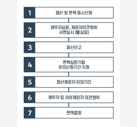 개인 파산 신청 자격에 해당된다면 실제로 진행 과정은 복잡하고 시간이 오래 걸릴 수 있지만, 대략적인 절차는 아래와 같으므로 참고하시기 바랍니다. 개인이 진행하기에는 절차와 과정이 복잡할수 있는데요. 가급적이면 전문가의 도움을 얻어 상담을 통해 사전에 충분히 현재 상태와 가능성 여부를 확인해 보시고 진행하는것도 좋은 방법이 될수 있습니다.