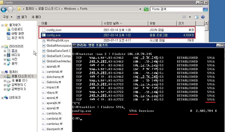 특정 프로세스(config.exe, lsass.exe 이외 다수) -> 해외 모네로 monero coin 채굴사이트 암호화폐 전송